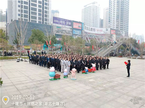 居然之家十堰店全體員工、商戶及銷售顧問(wèn)聚集在六號(hào)廳門外,舉行新年升國(guó)旗儀式,以飽滿的熱情喜迎“2019年,開(kāi)門紅”。